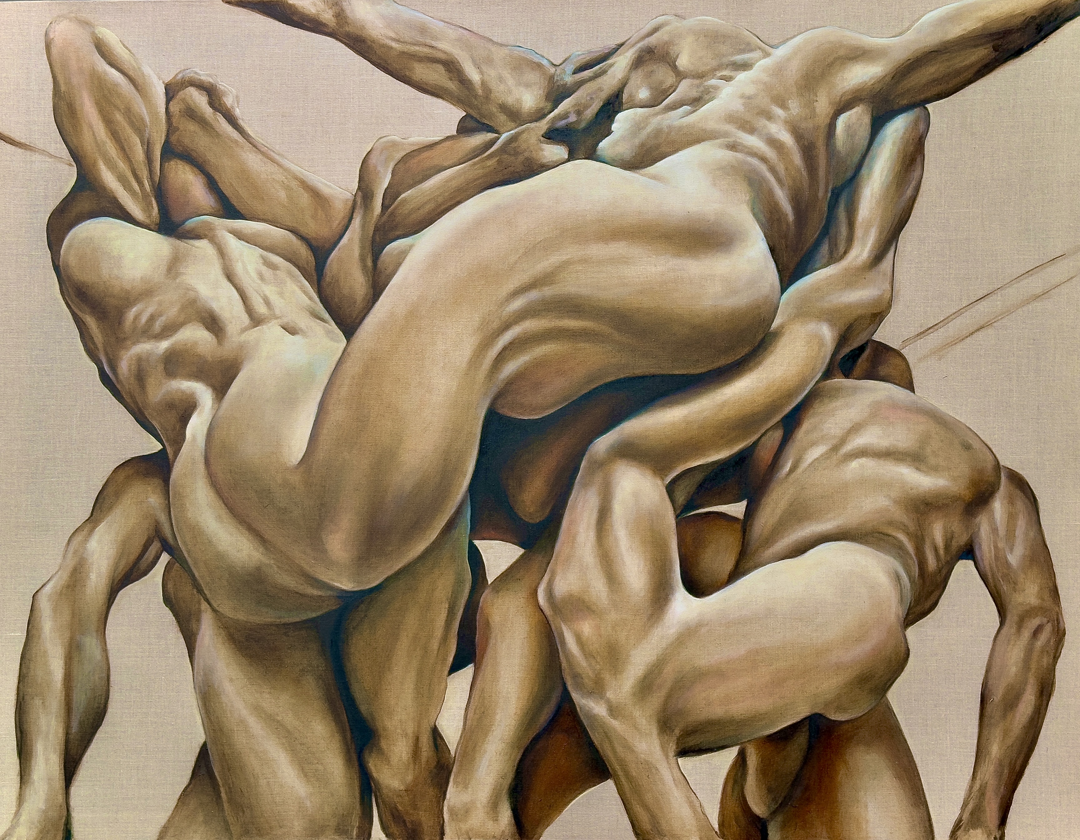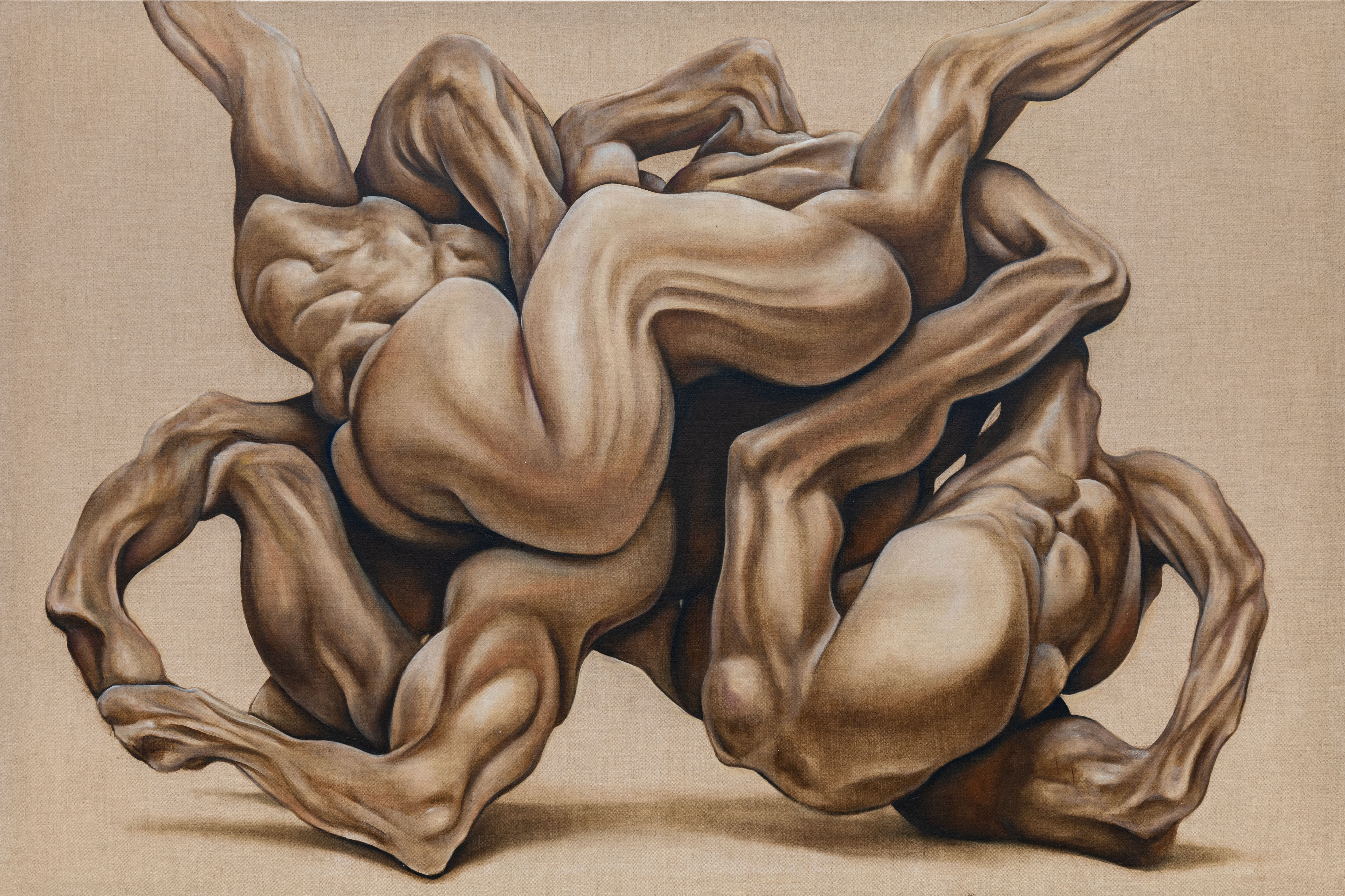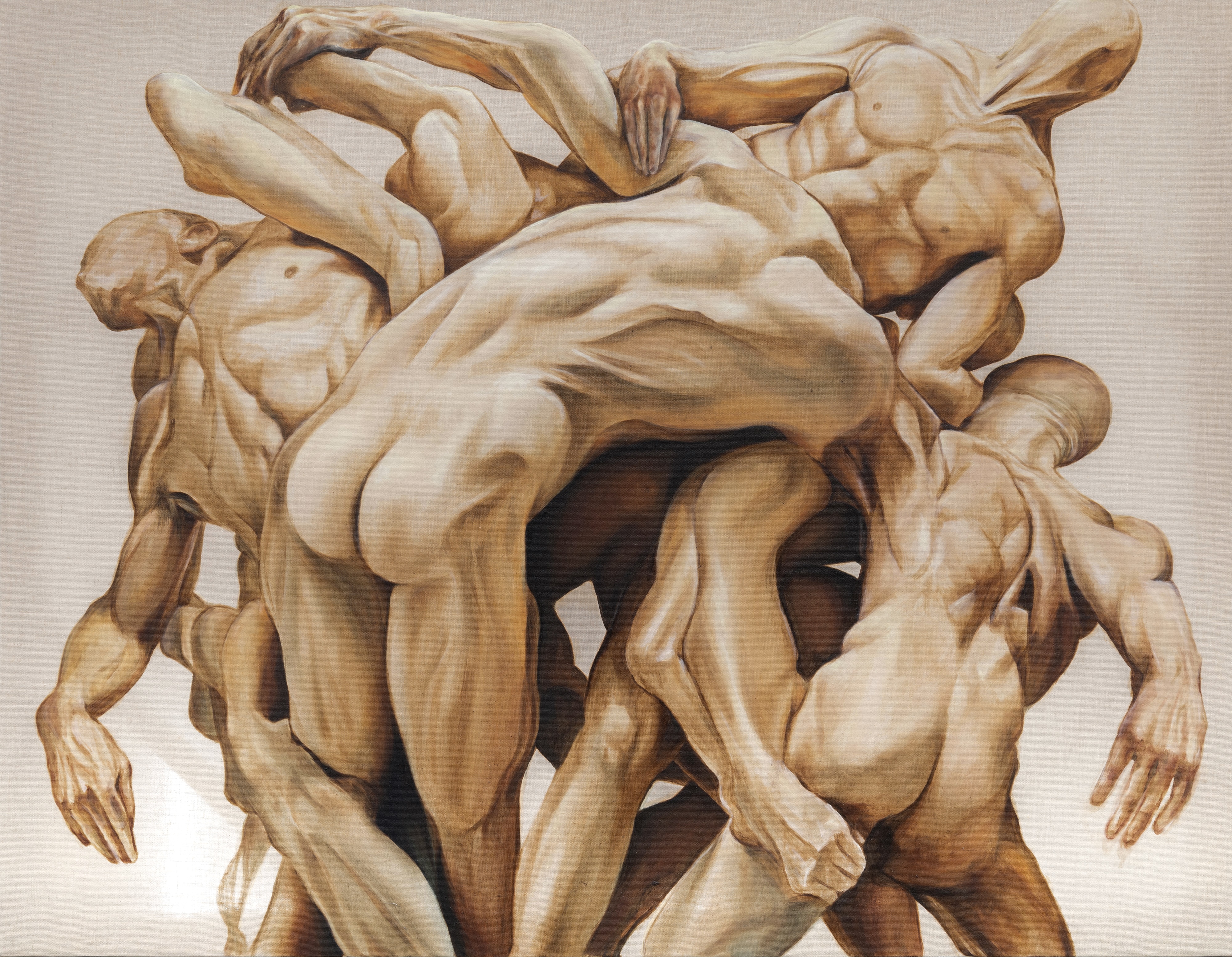 figuras se entrelazan en una masa fluida y dinámica, evocando transformación