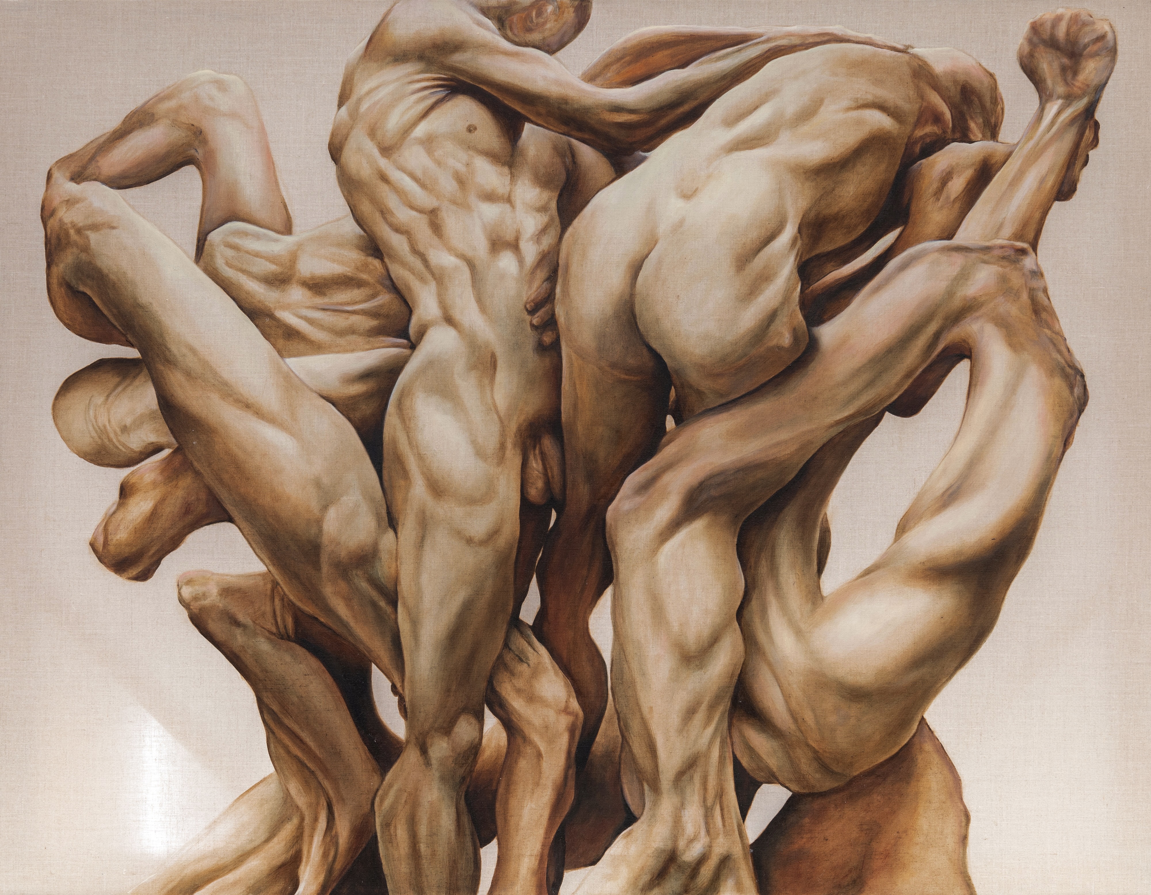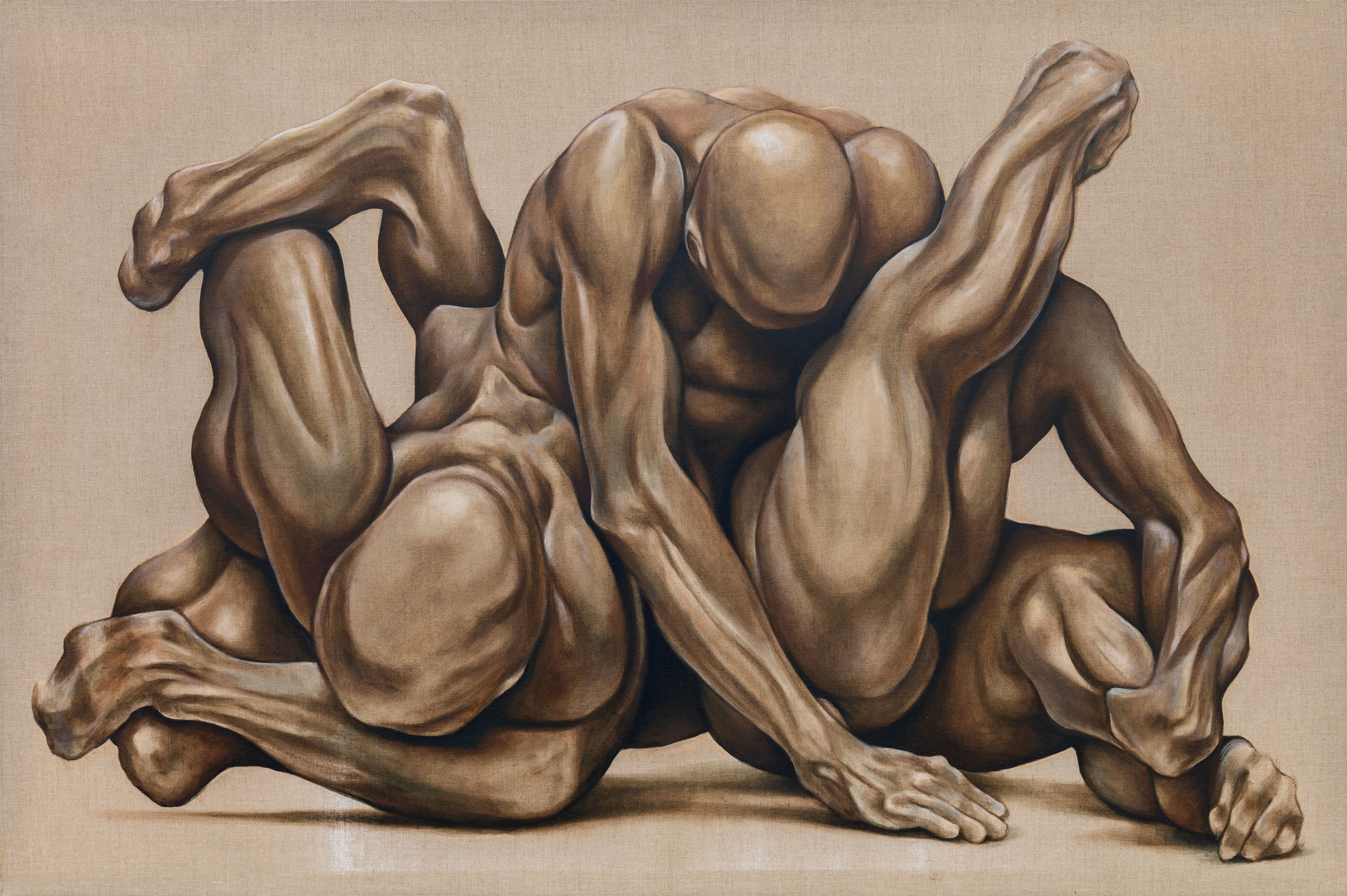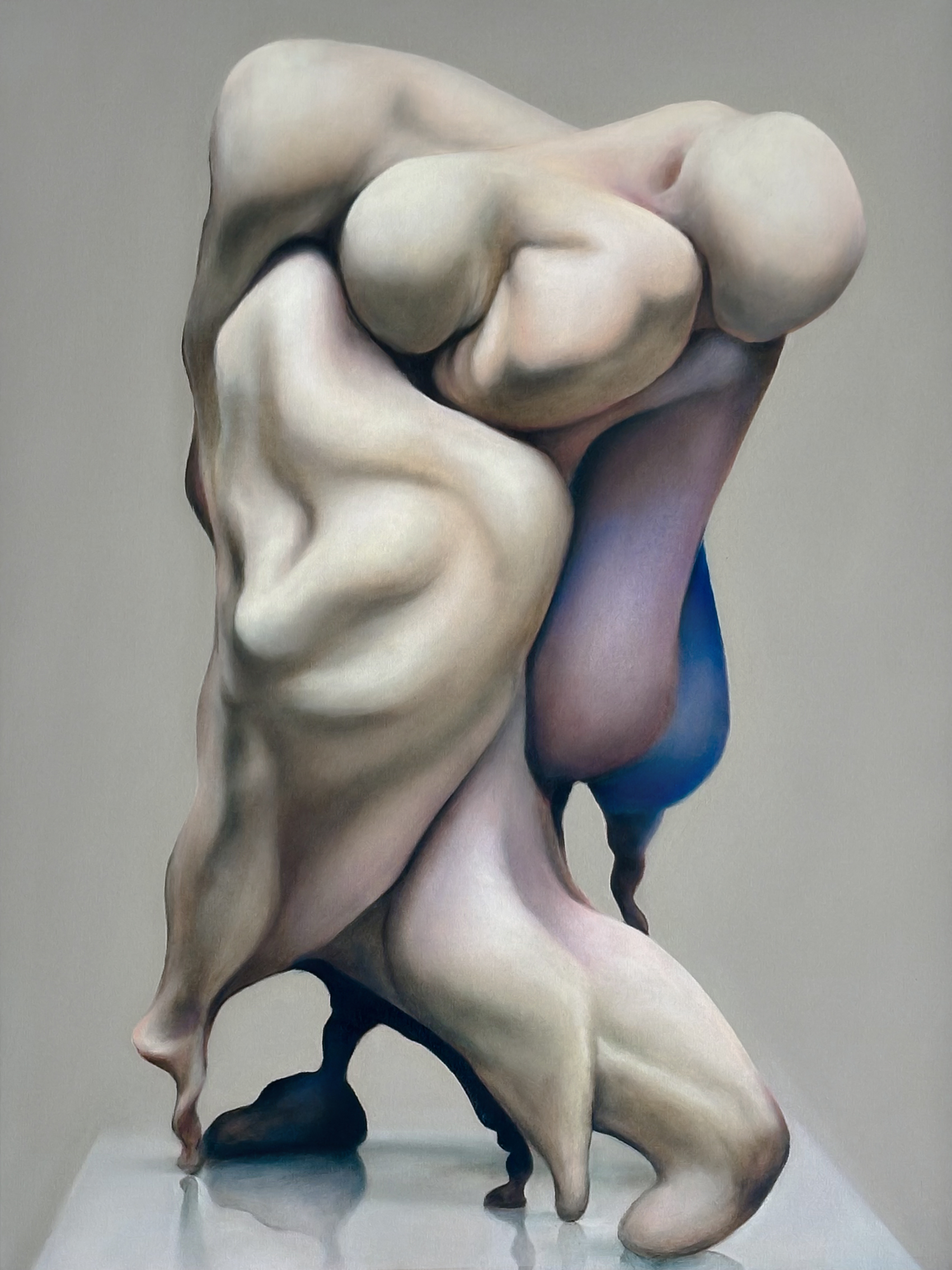 figuras se entrelazan en una masa fluida y dinámica, evocando transformación