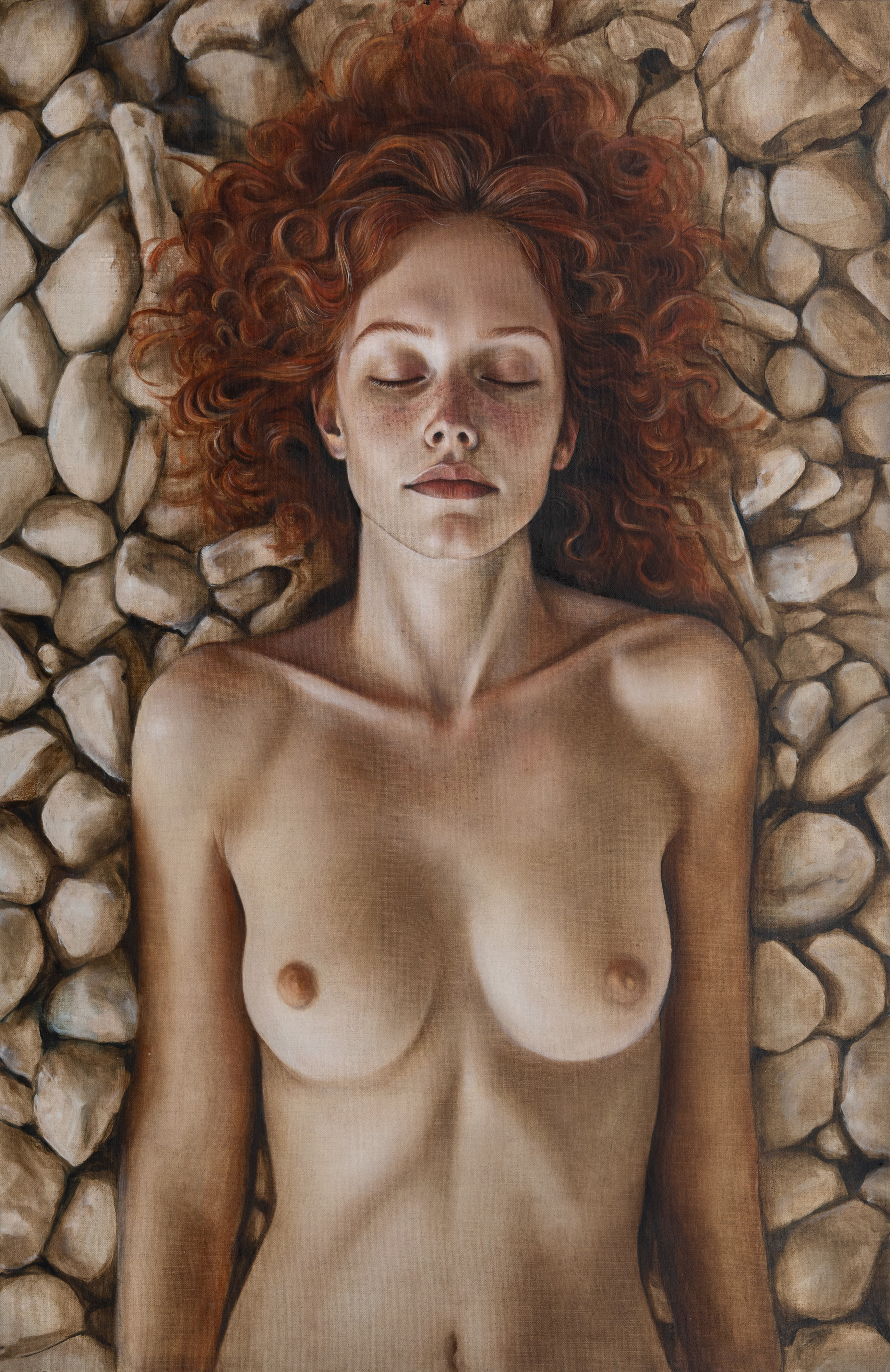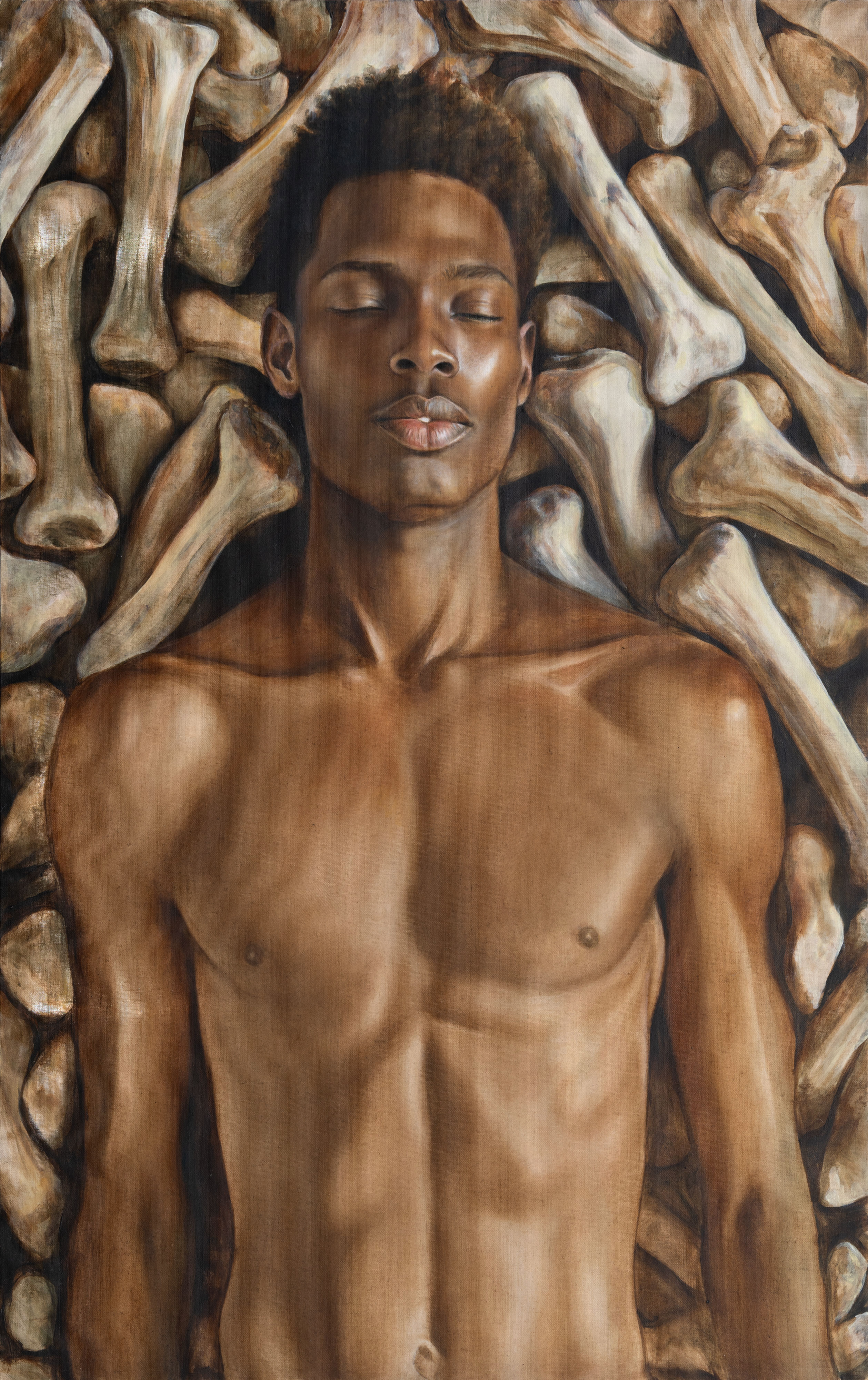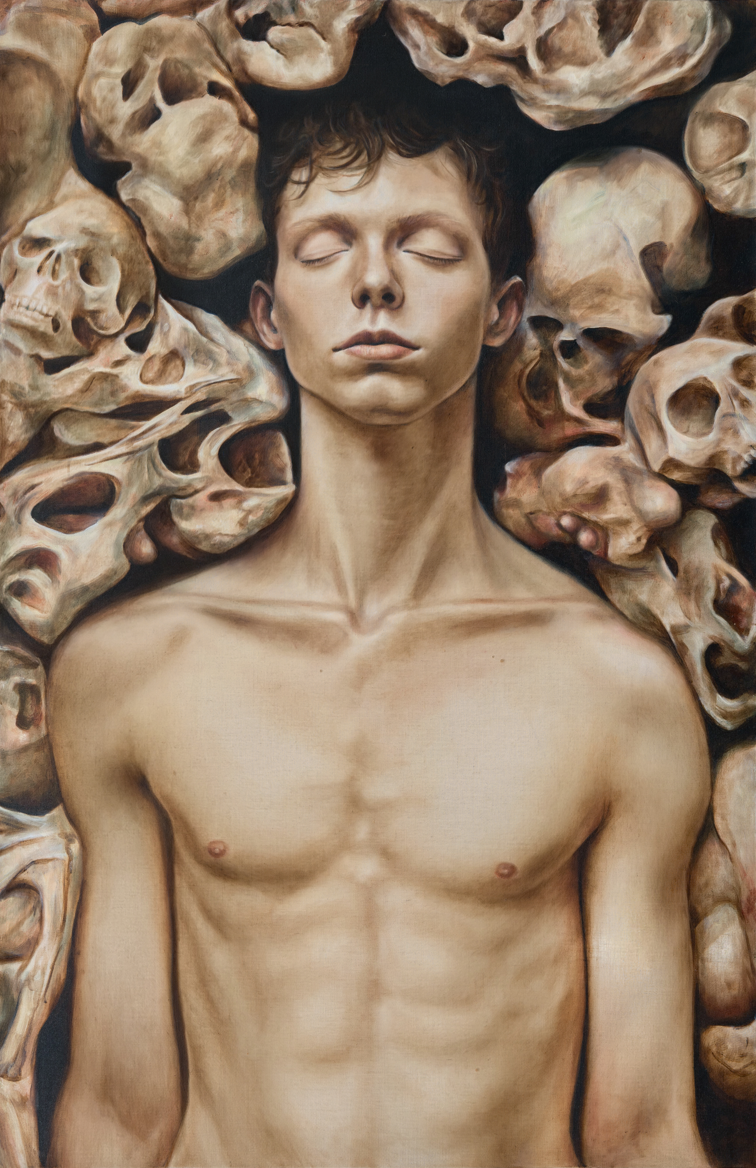 Después del goce reúne una serie de pinturas donde el cuerpo se ofrece como territorio de silencio y de belleza interrumpida. Jóvenes cuerpos —dóciles, serenos, expuestos— reposan sobre calaveras y huesos en una escena que oscila entre la contemplación y la ruina. No hay violencia ni dramatismo, sino una calma tensa que parece contener la memoria de un deseo que ya se consumió.