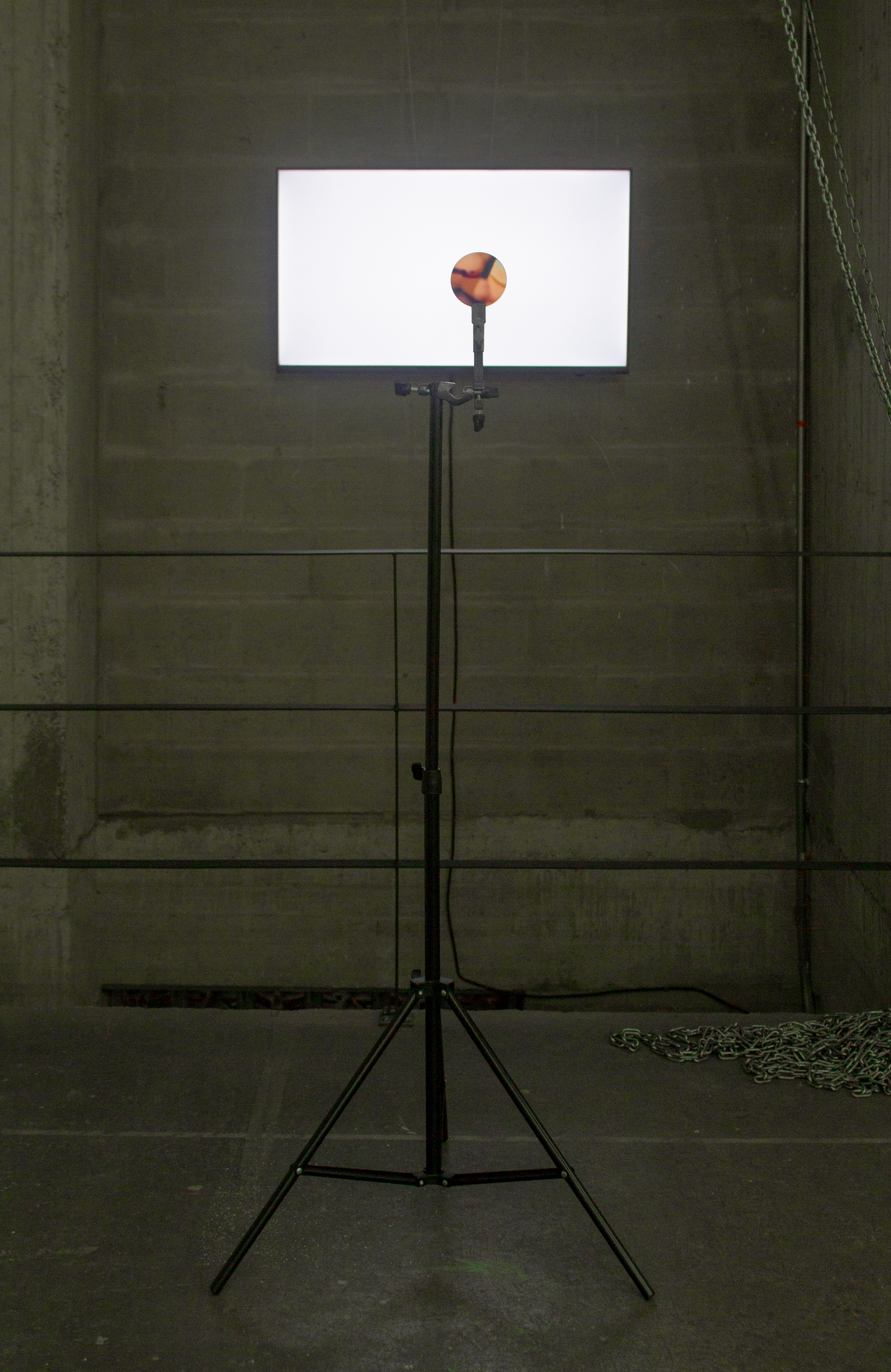 Esta orgía audiovisual de bits convierte al espectador en un voyeur involuntario, quien se ve obligadoasomarse para contemplar las masas de carne que se proyectan en la pantalla de televisor. La imagen, concebida por el algoritmo de inteligencia artificial, solo se revela cuando el espectador observa a través de un filtro polarizado; desde cualquier otro ángulo, la pantalla permanece en blanco.