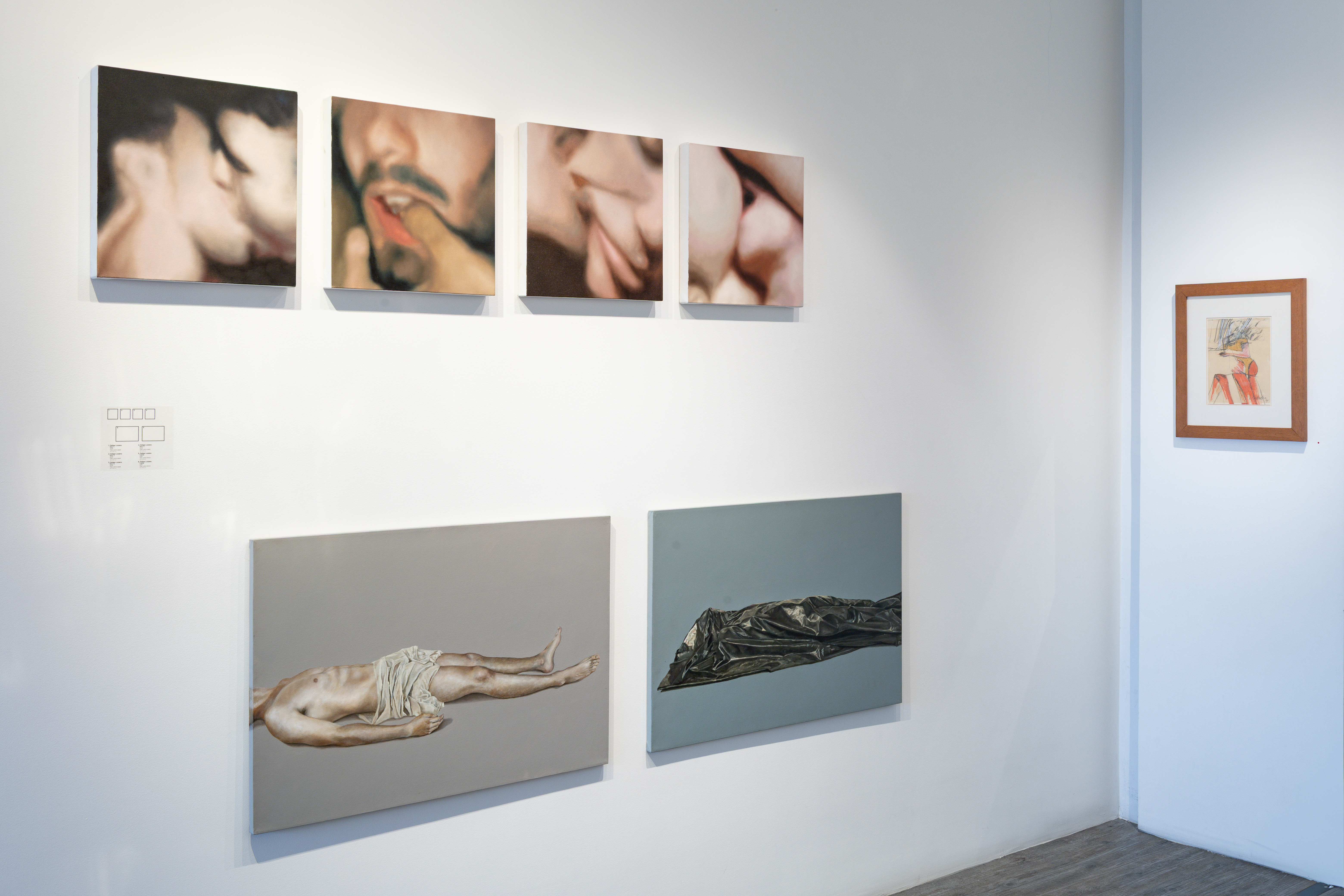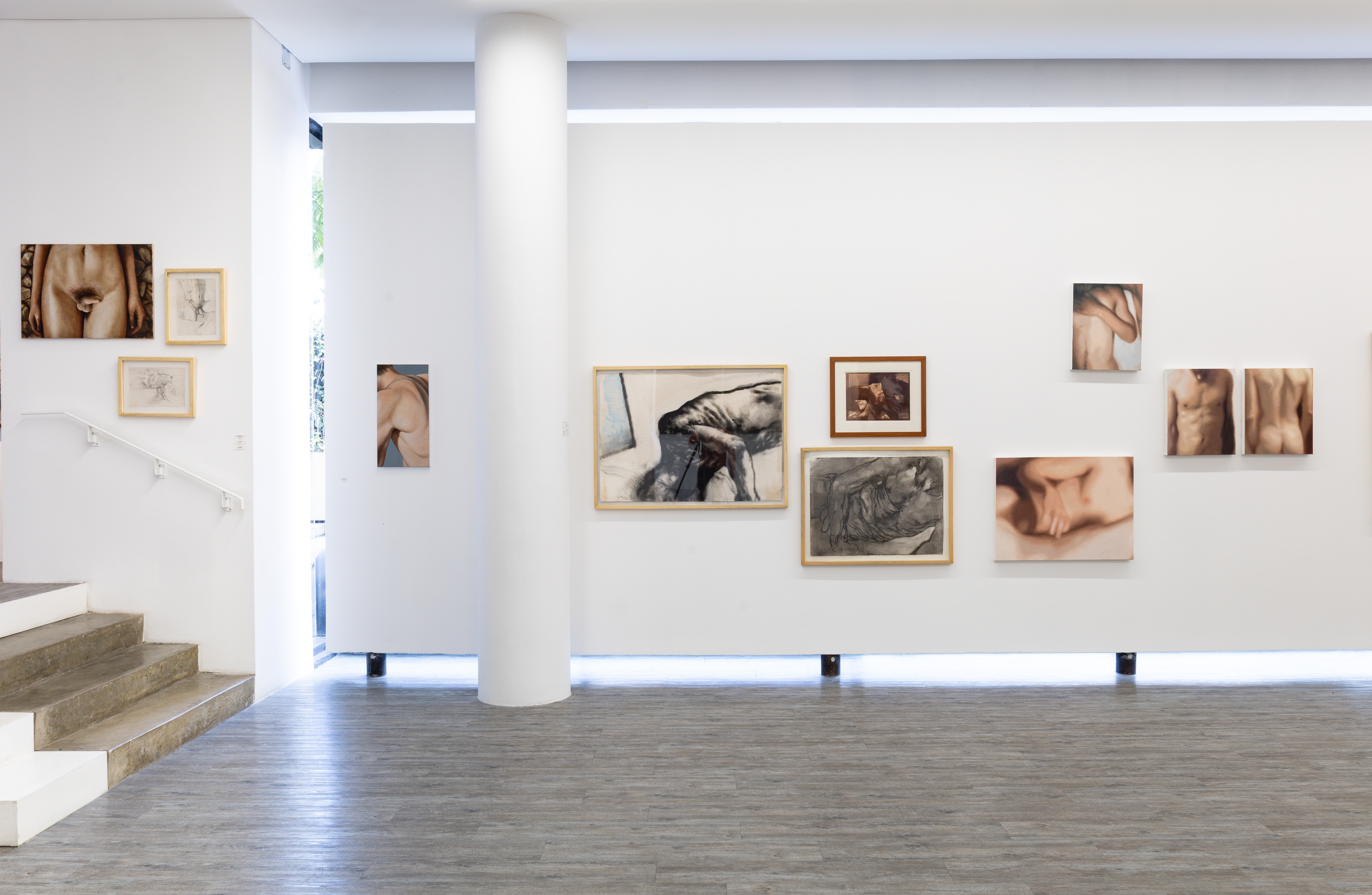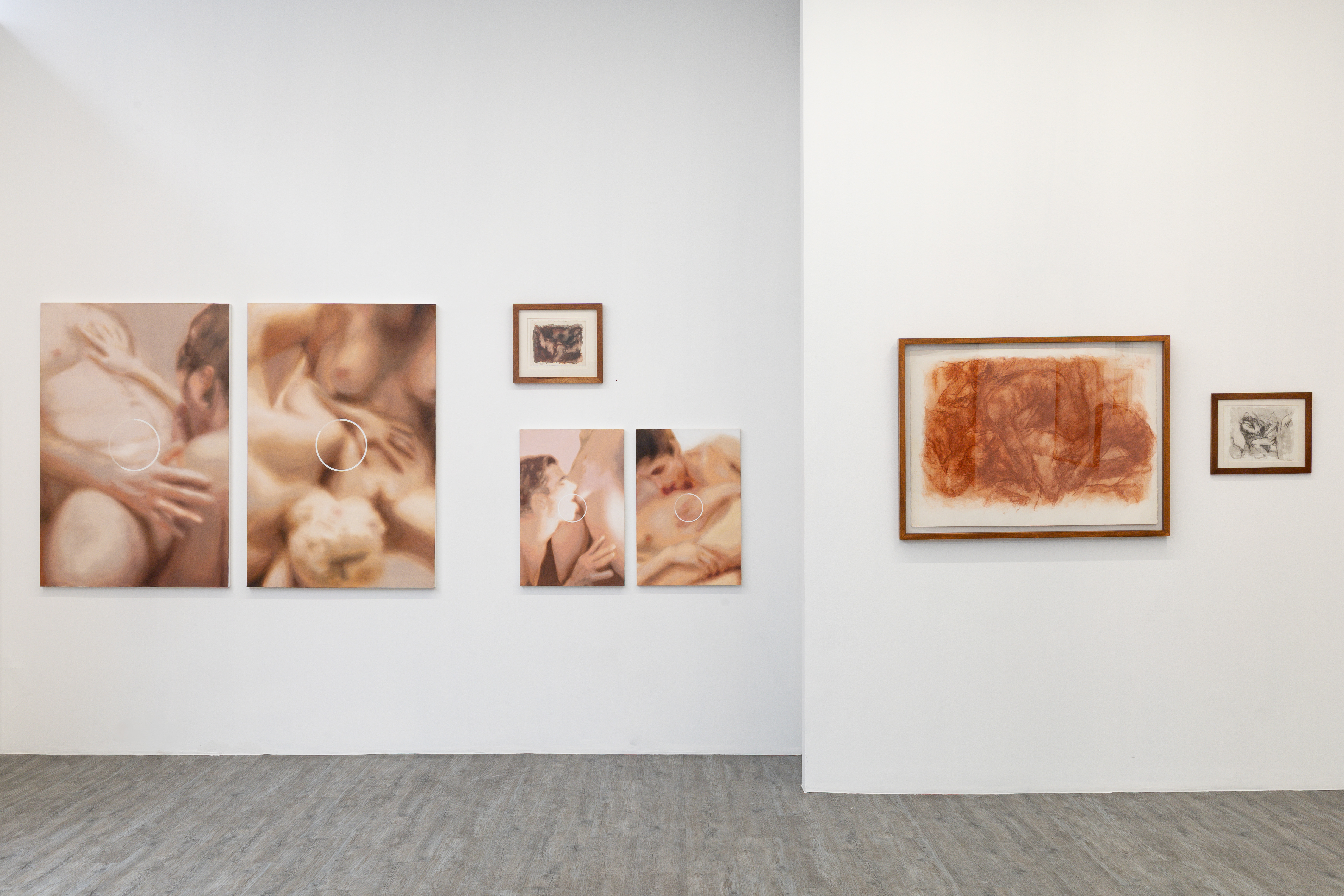 Some of his paintings stem from digital images — such as those that interrupt pornographic scenes with loading symbols — gestures that frustrate the logic of immediacy and open a pause to confront desire through waiting. In other pieces, bodies dissolve into painterly gestures that evoke a state of delirium or transformation. And finally, there are works in which bodies rest in suspension, as if desire had already been exhausted and only the memory of contact remained — the trace of pleasure.