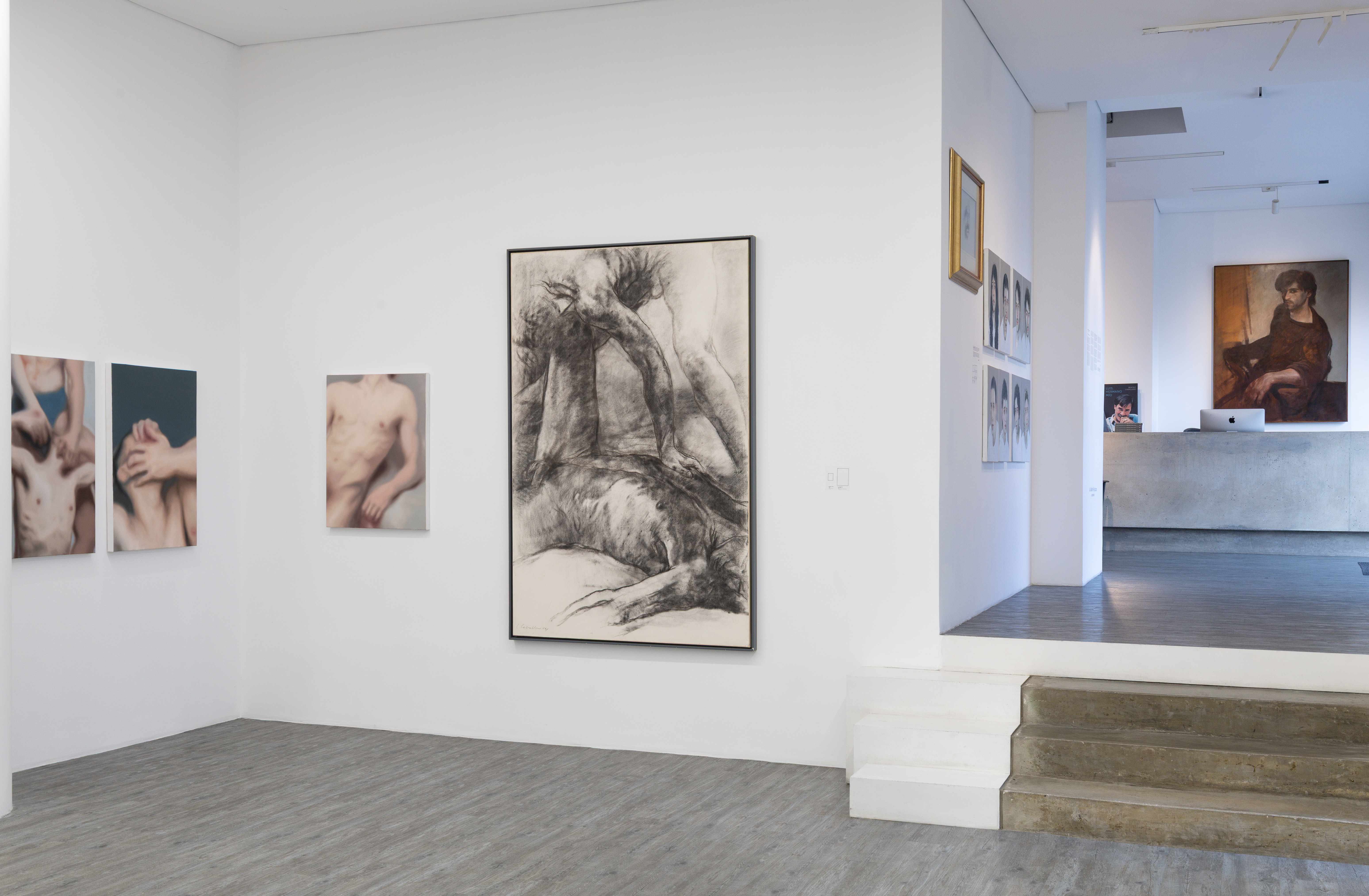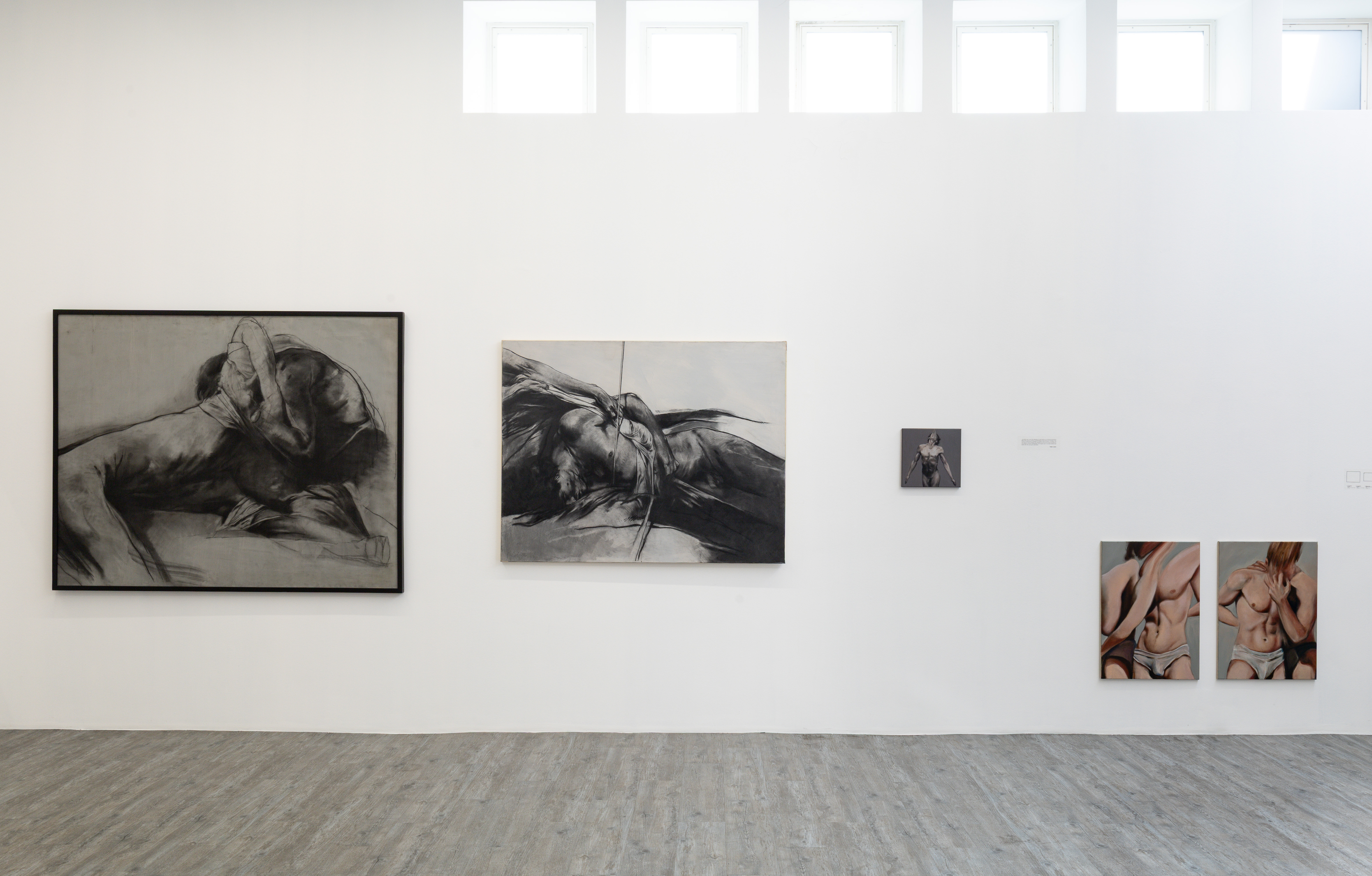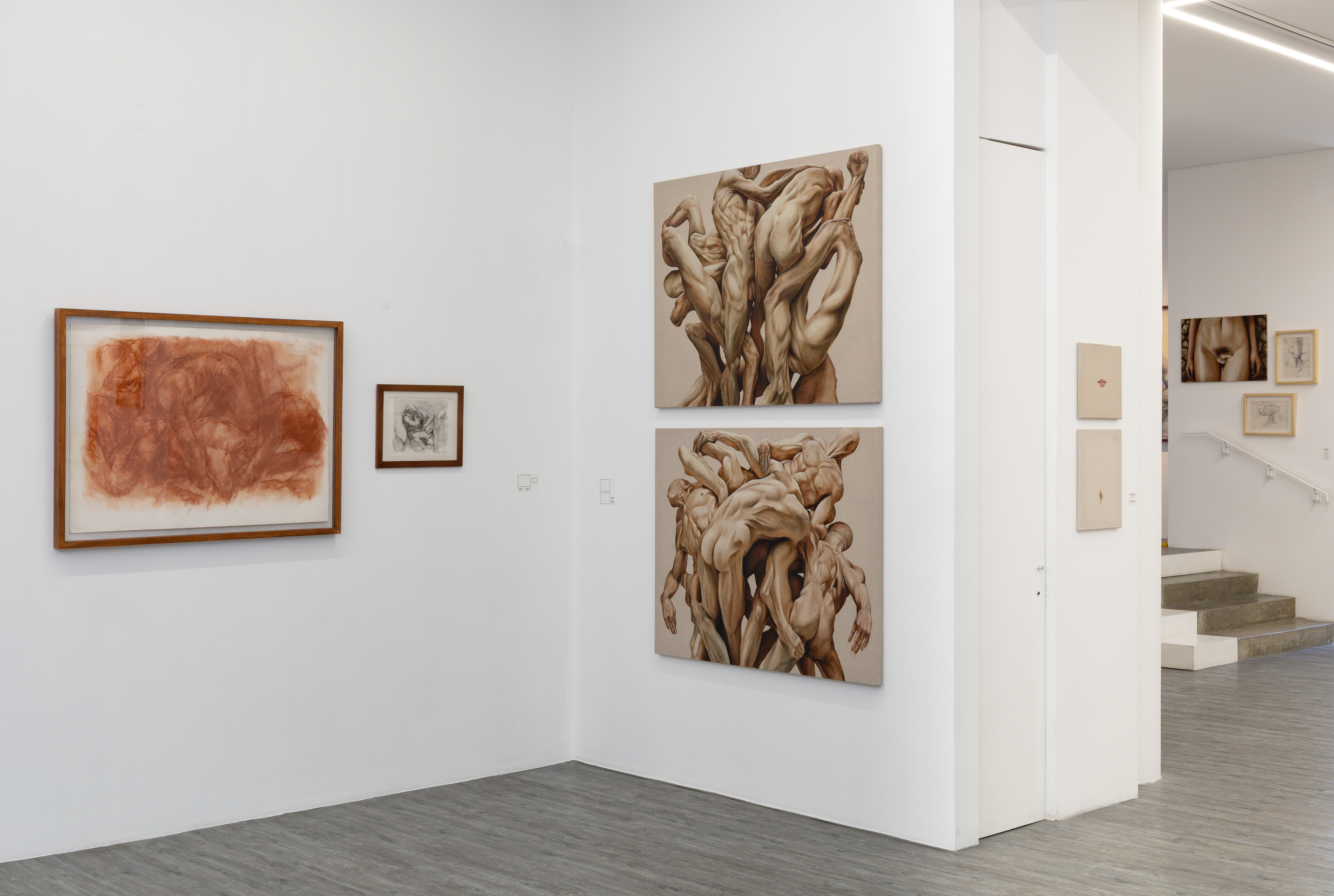 Some of his paintings stem from digital images — such as those that interrupt pornographic scenes with loading symbols — gestures that frustrate the logic of immediacy and open a pause to confront desire through waiting. In other pieces, bodies dissolve into painterly gestures that evoke a state of delirium or transformation. And finally, there are works in which bodies rest in suspension, as if desire had already been exhausted and only the memory of contact remained — the trace of pleasure.