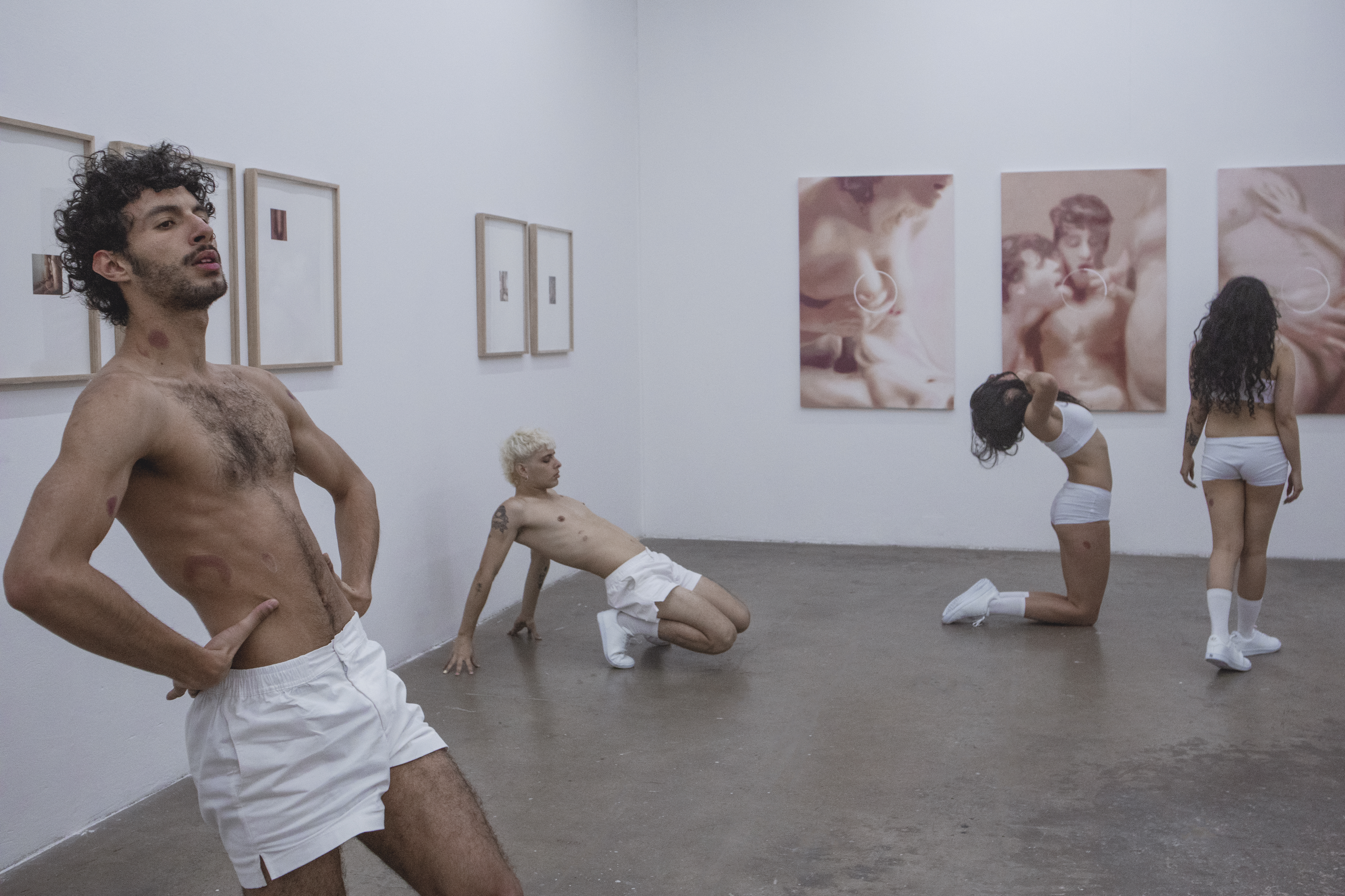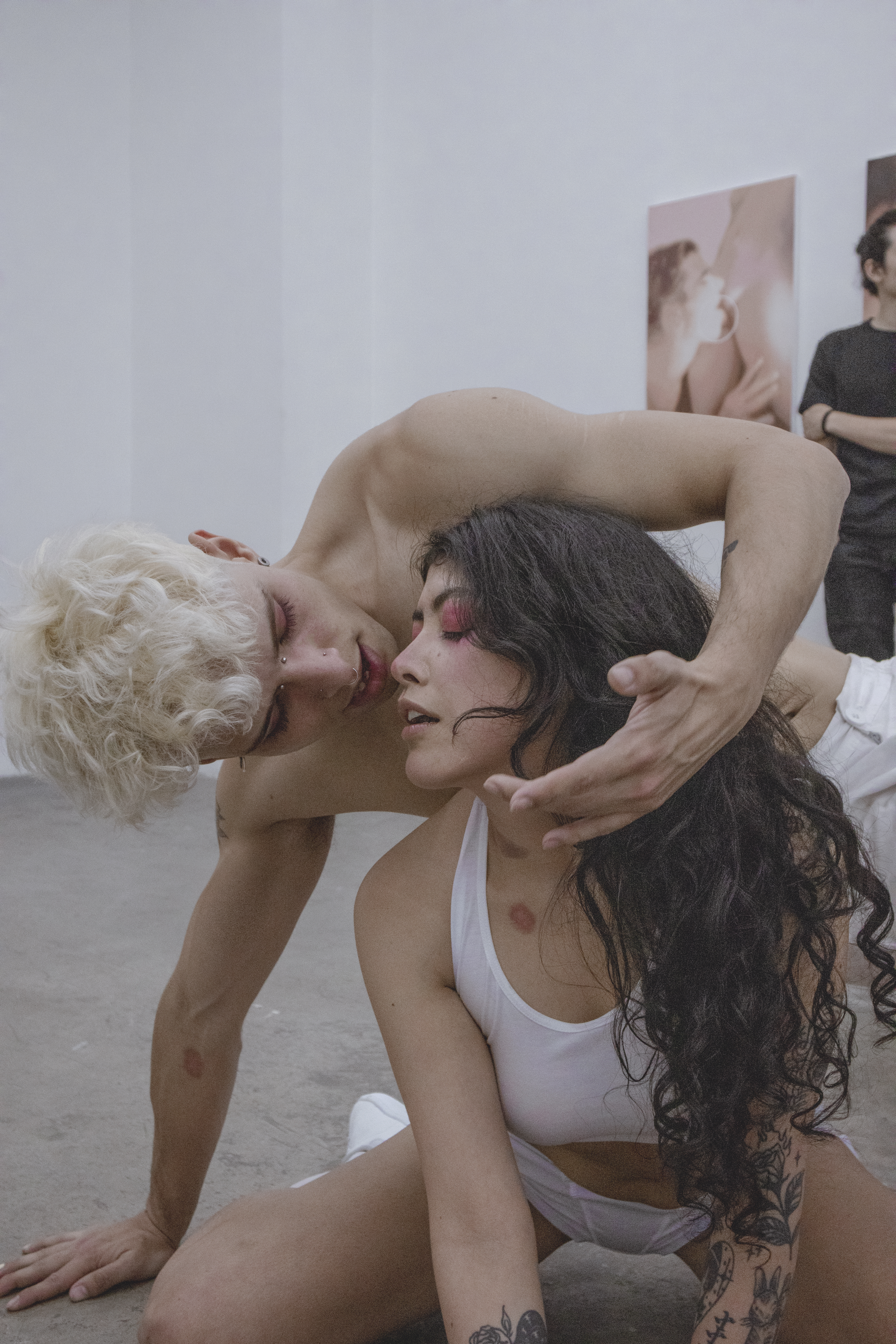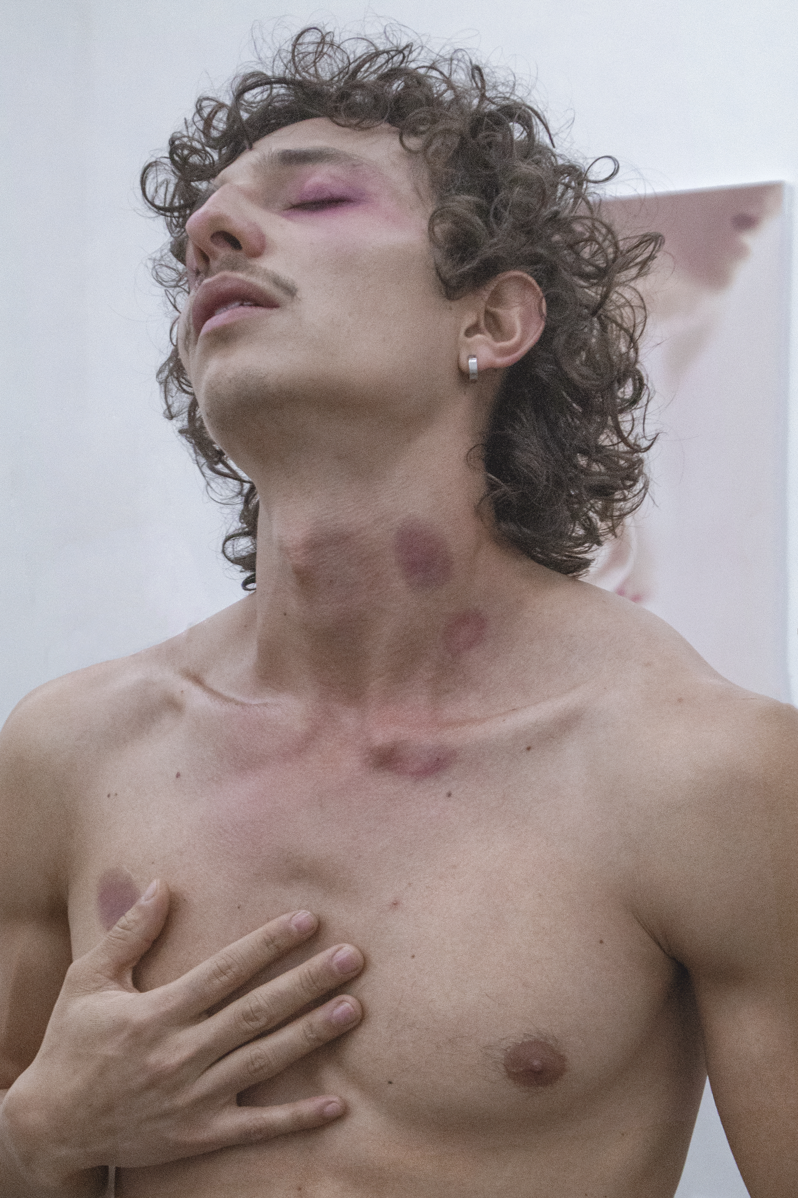 semidesnudos, lucen tatuajes temporales de hematomas realizados por el artista en sus cuerpos, mientras exploran el espacio buscándose