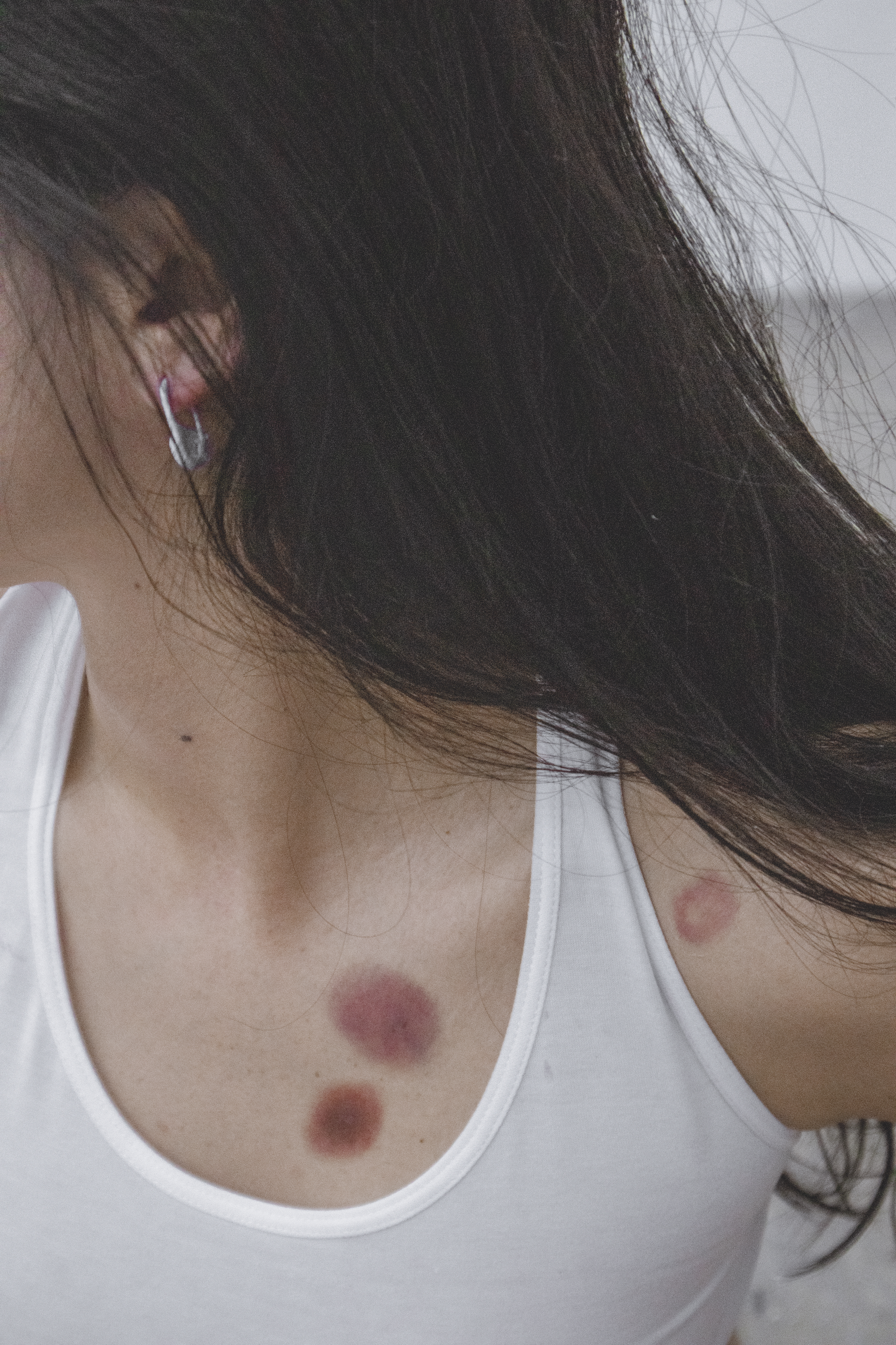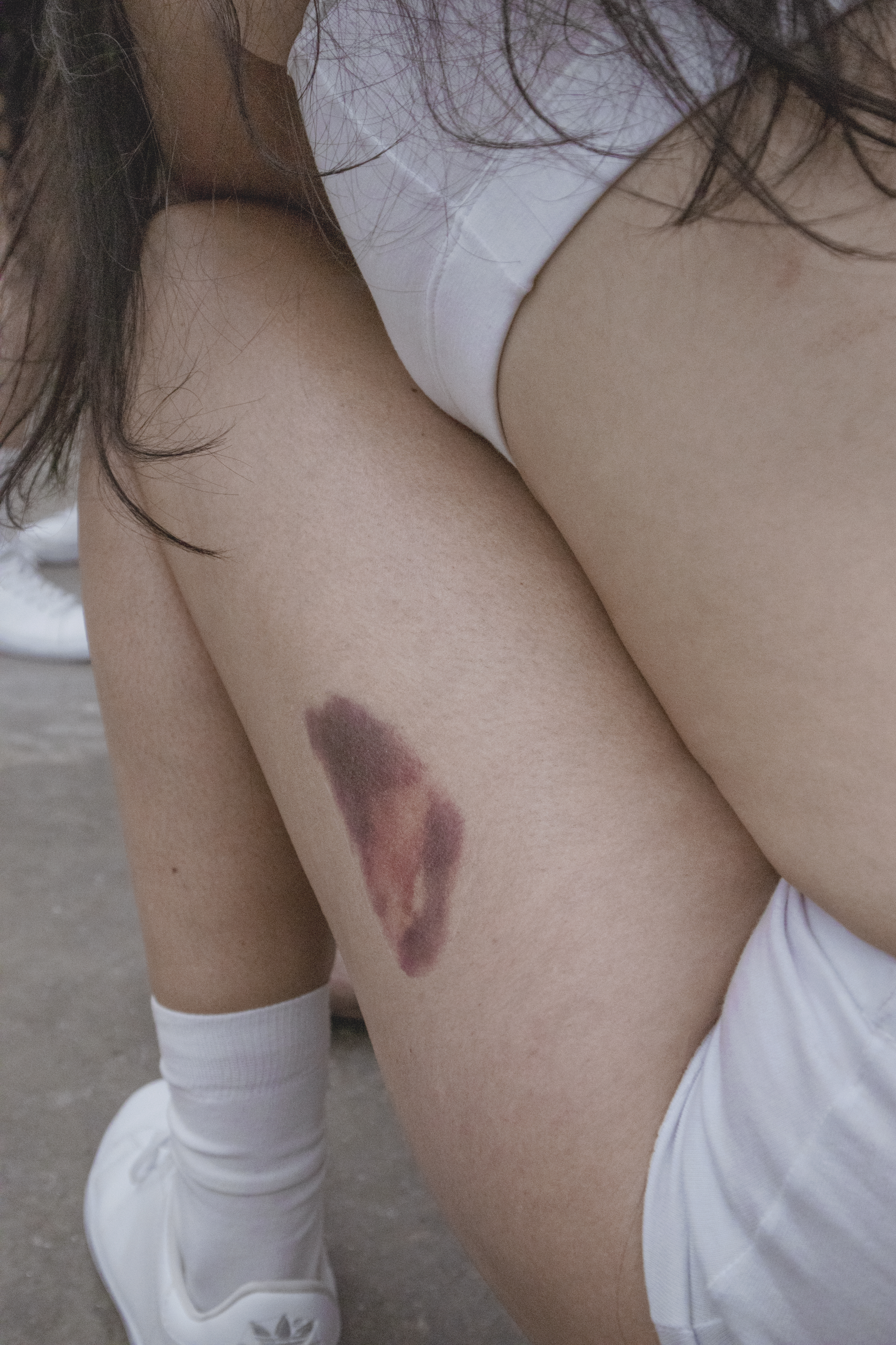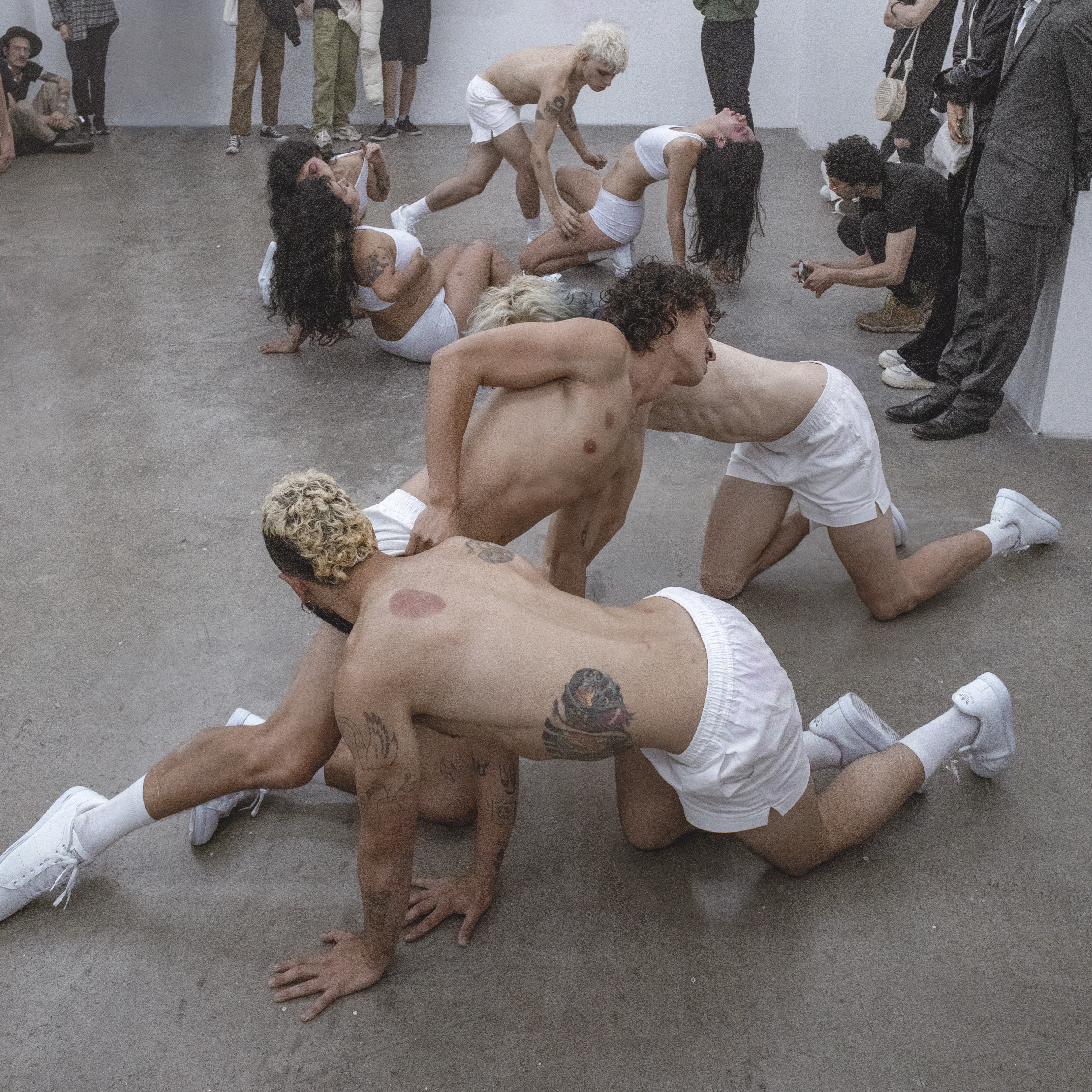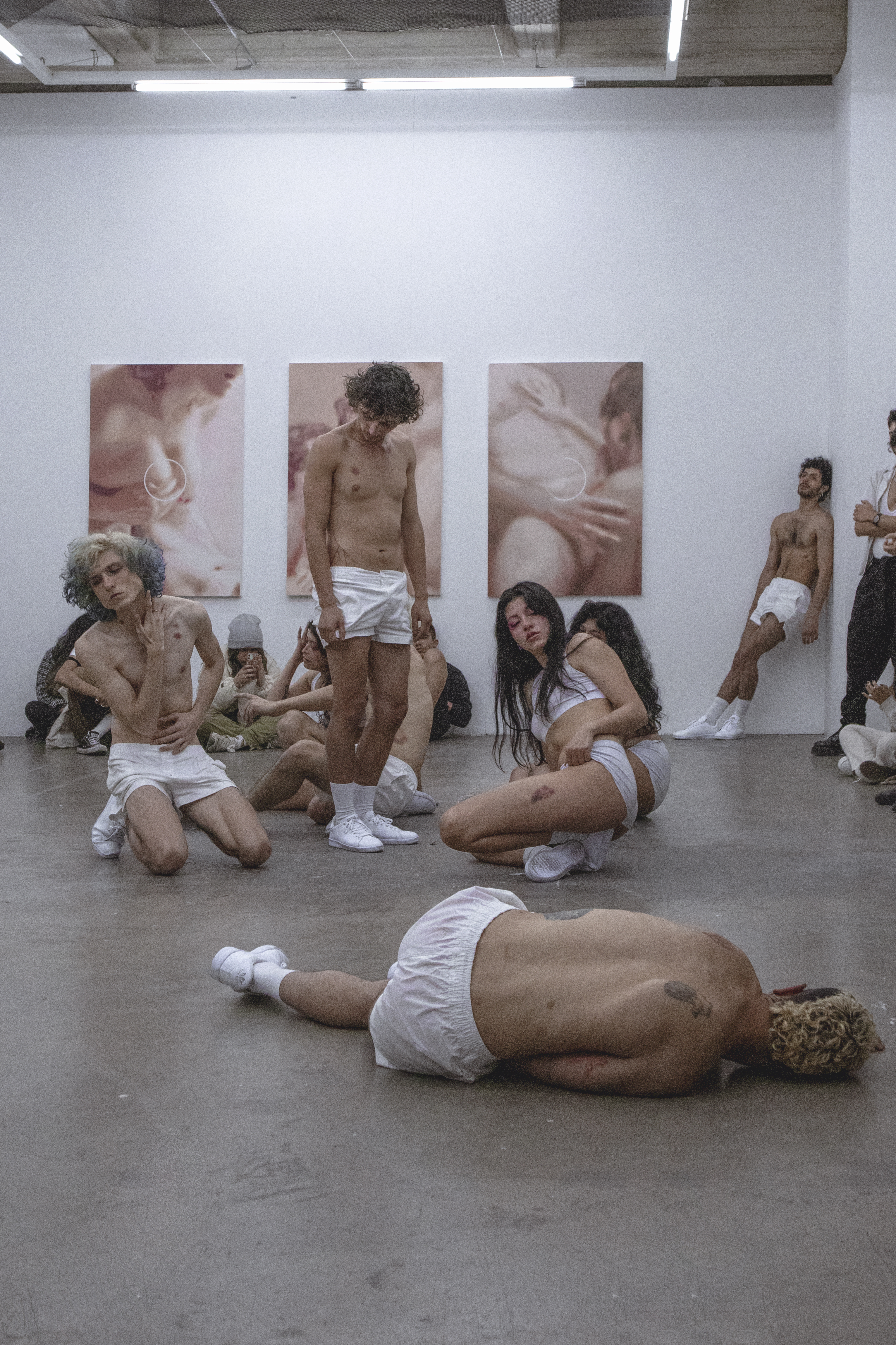 semidesnudos, lucen tatuajes temporales de hematomas realizados por el artista en sus cuerpos, mientras exploran el espacio buscándose